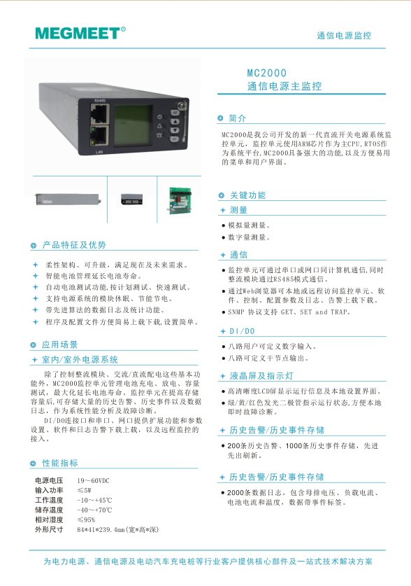 本規(guī)格的監(jiān)控模塊支持19V-60V直流電壓供電,由母排電壓或電池電壓供電。監(jiān)控模塊提供完善的電源模塊節(jié)能管理和蓄電池充放電管理功能;具有開關(guān)量檢測上報,母排電壓、負(fù)載電流、電池電壓、電池電流、電池溫度、環(huán)境溫度和備用模擬量上報功能;提供交流配電檢測和上報告警功能,同時具有控制負(fù)載下電和電池保護(hù)功能;監(jiān)控模塊提供LCD顯示,可通過LCD屏查看系統(tǒng)信息,以及對系統(tǒng)參數(shù)進(jìn)行設(shè)置。監(jiān)控模塊可通過RS232/RS485與上位機(jī)通訊,通過RS485總線與整流模塊通訊;可通過Ethernet接口與用戶主站通訊,采用TCP/IP協(xié)議,支持WEB網(wǎng)頁操作功能,支持SNMP網(wǎng)絡(luò)管理,支持遠(yuǎn)程升級程序。